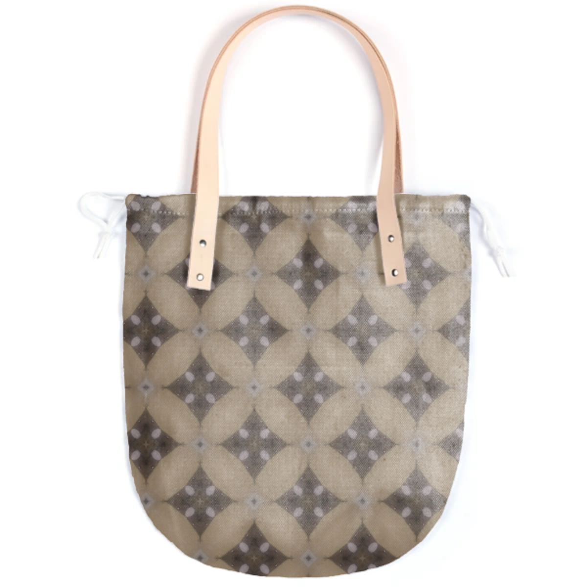 The Summer tote features a round bottom shape small inside patch pocket and tan or black leather handles.
