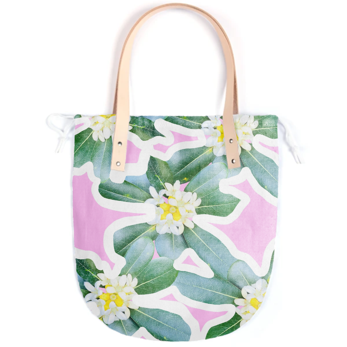 The Summer tote features a round bottom shape small inside patch pocket and tan or black leather handles.
