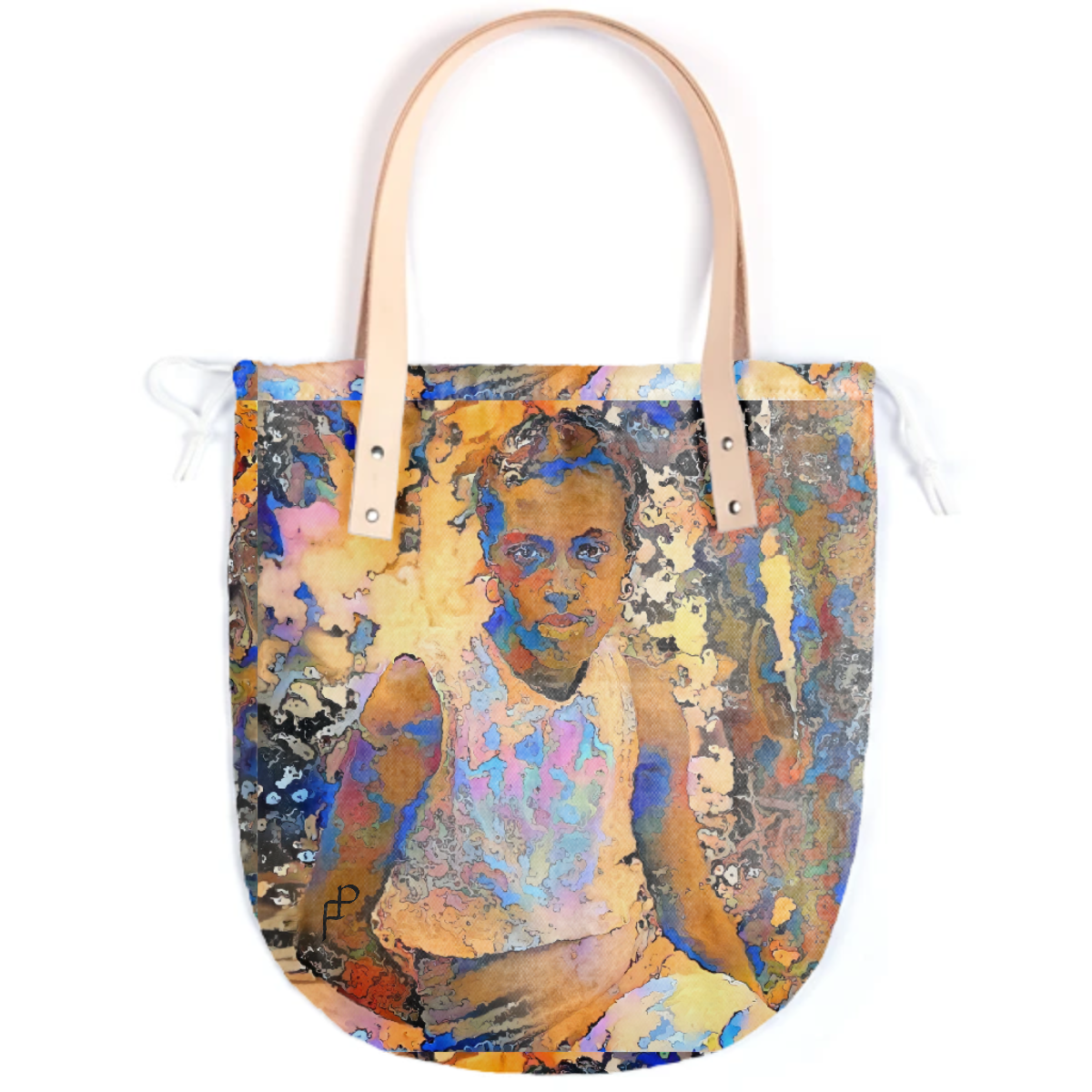 The Summer tote features a round bottom shape small inside patch pocket and tan or black leather handles.