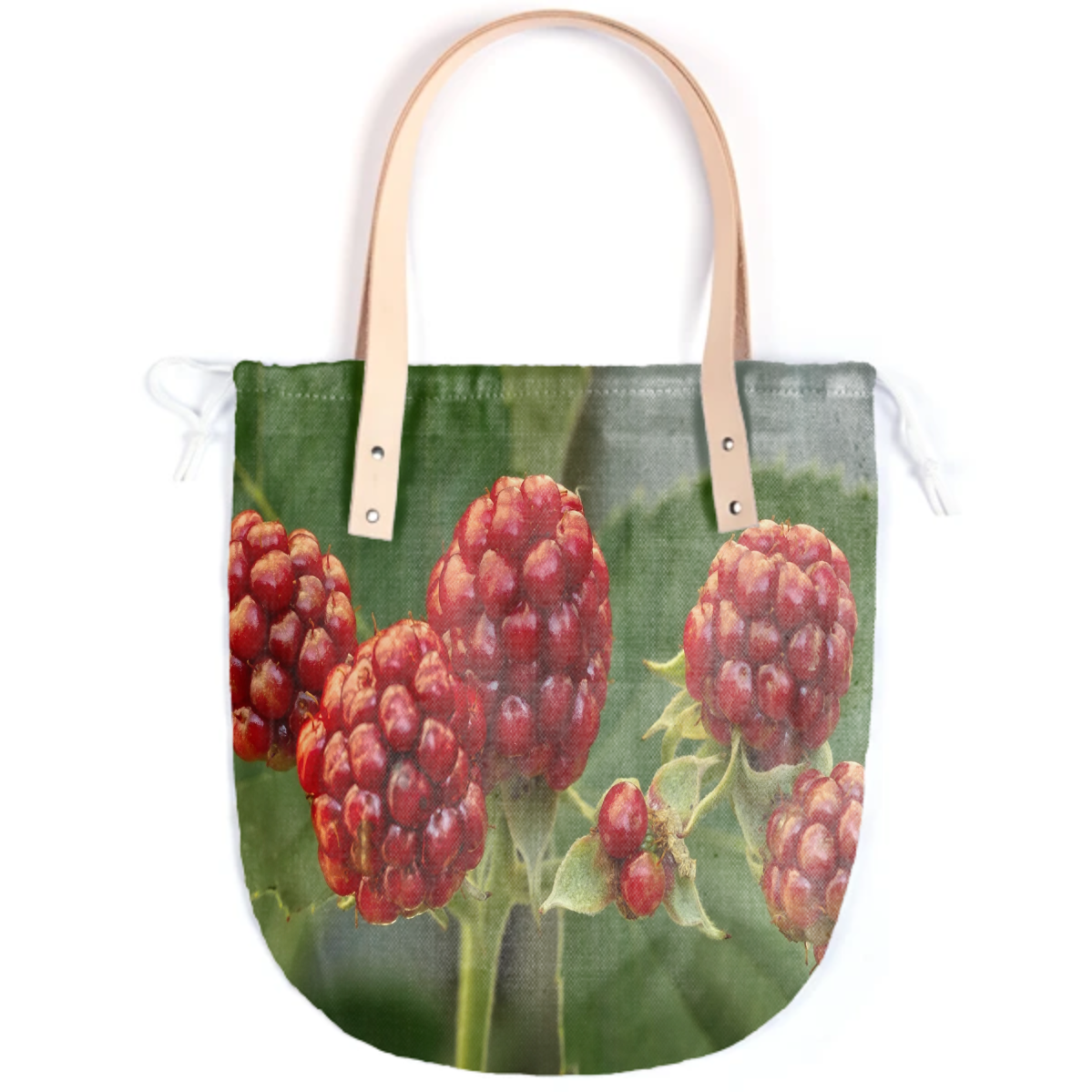 The Summer tote features a round bottom shape small inside patch pocket and tan or black leather handles.