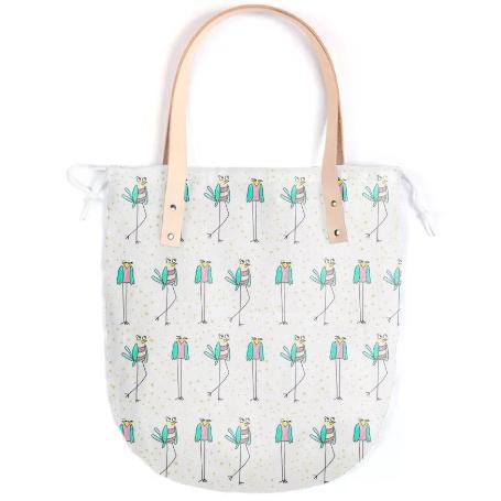 The Summer tote features a round bottom shape small inside patch pocket and tan or black leather handles.