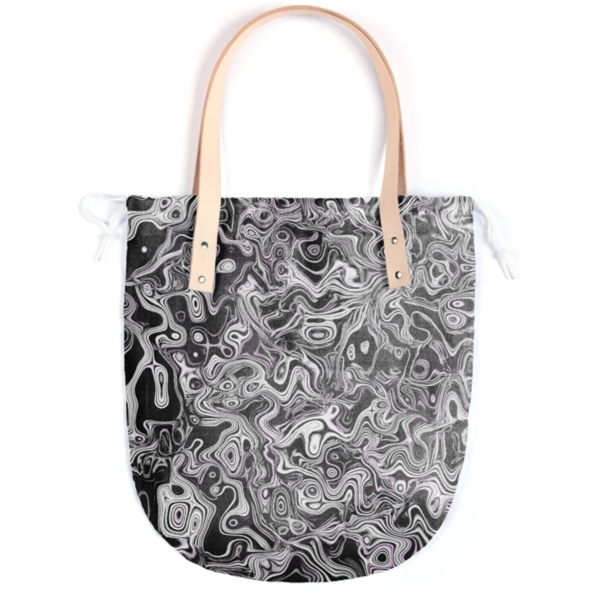 The Summer tote features a round bottom shape small inside patch pocket and tan or black leather handles.