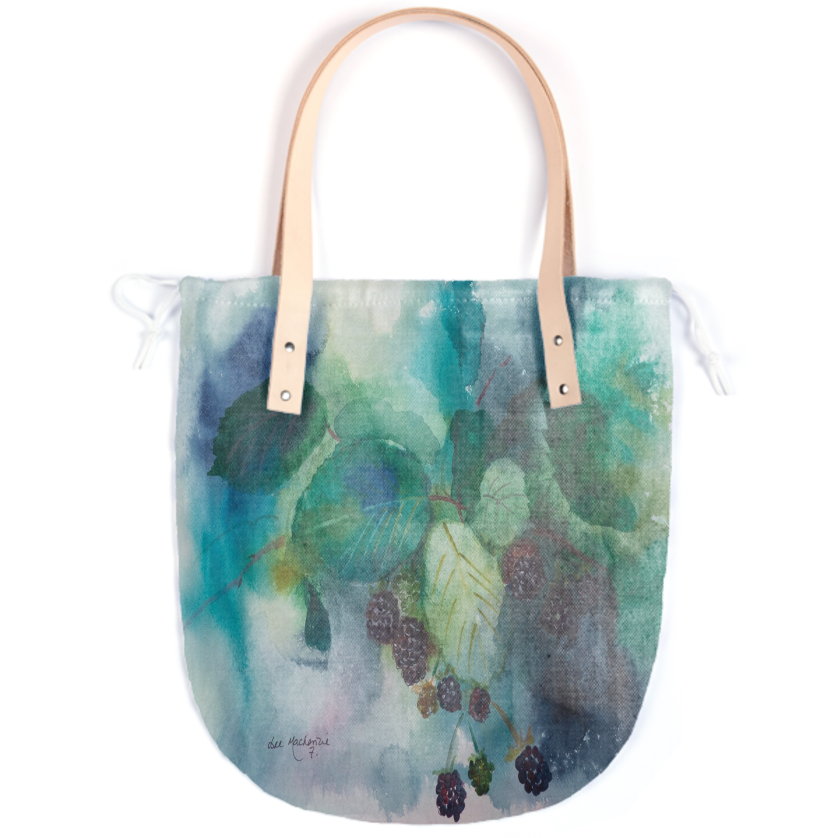 The Summer tote features a round bottom shape small inside patch pocket and tan or black leather handles.
