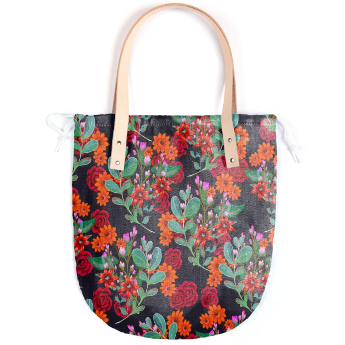 The Summer tote features a round bottom shape small inside patch pocket and tan or black leather handles.