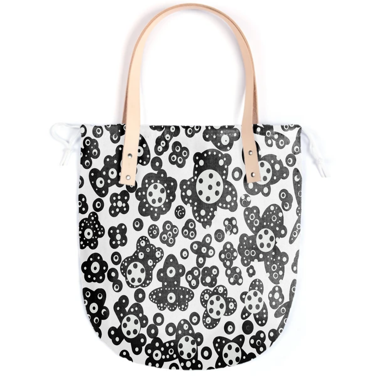 The Summer tote features a round bottom shape small inside patch pocket and tan or black leather handles.