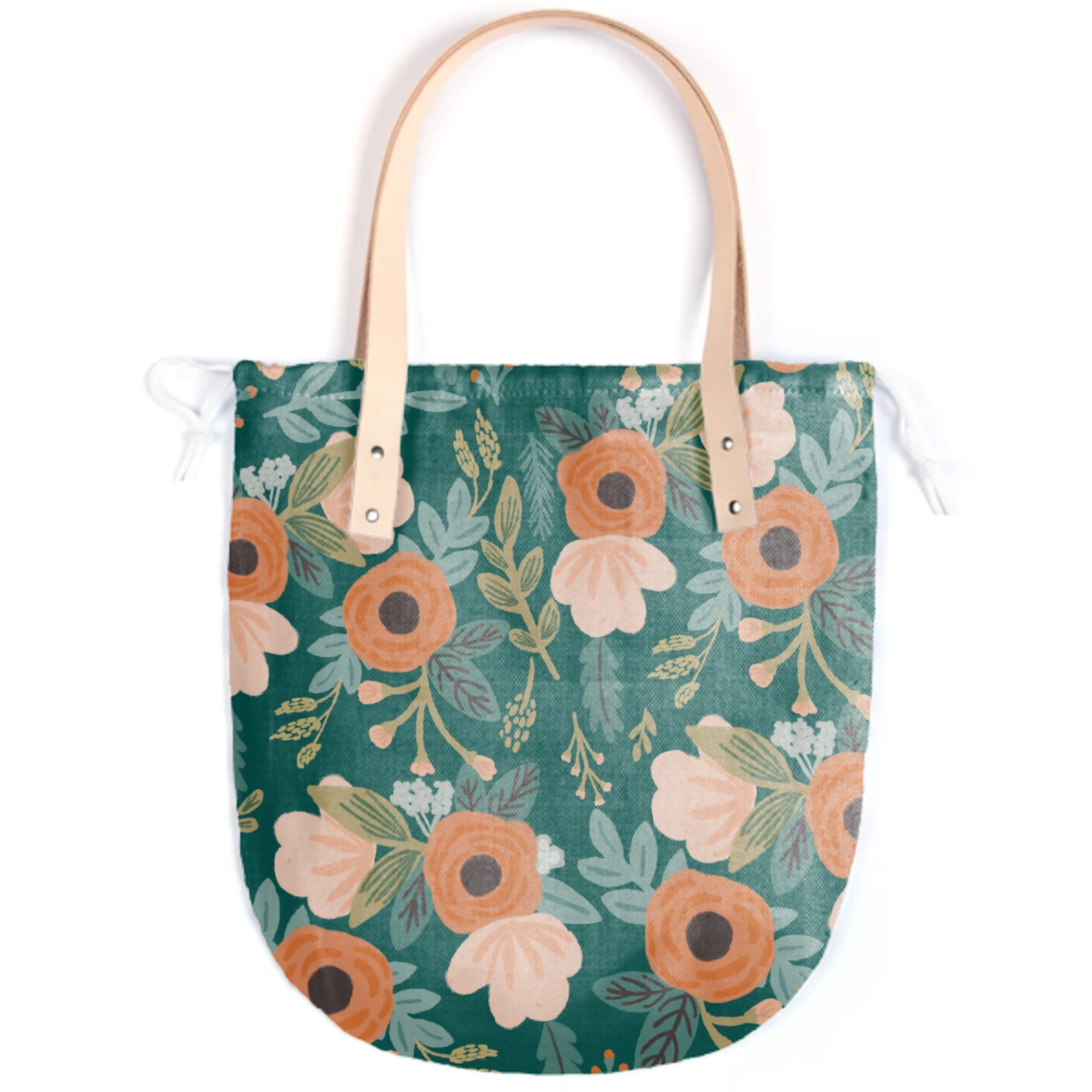 The Summer tote features a round bottom shape small inside patch pocket and tan or black leather handles.
