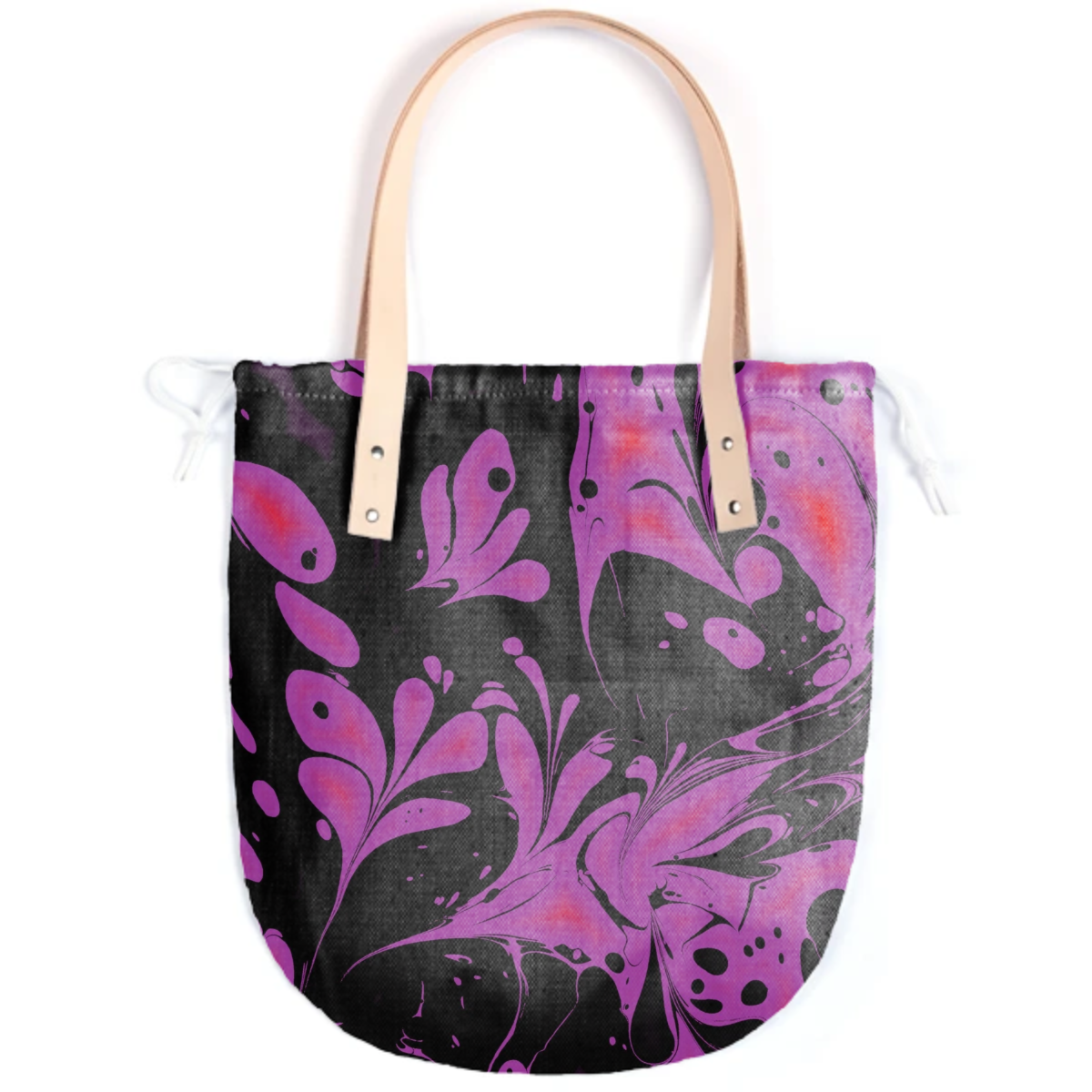 The Summer tote features a round bottom shape small inside patch pocket and tan or black leather handles.