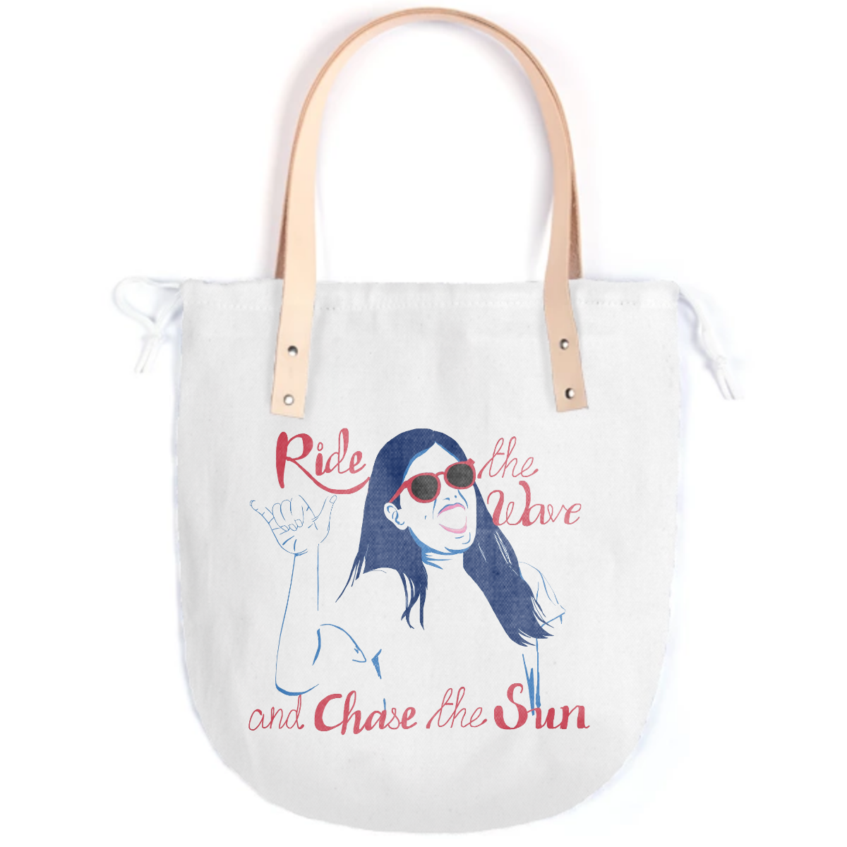 The Summer tote features a round bottom shape small inside patch pocket and tan or black leather handles.