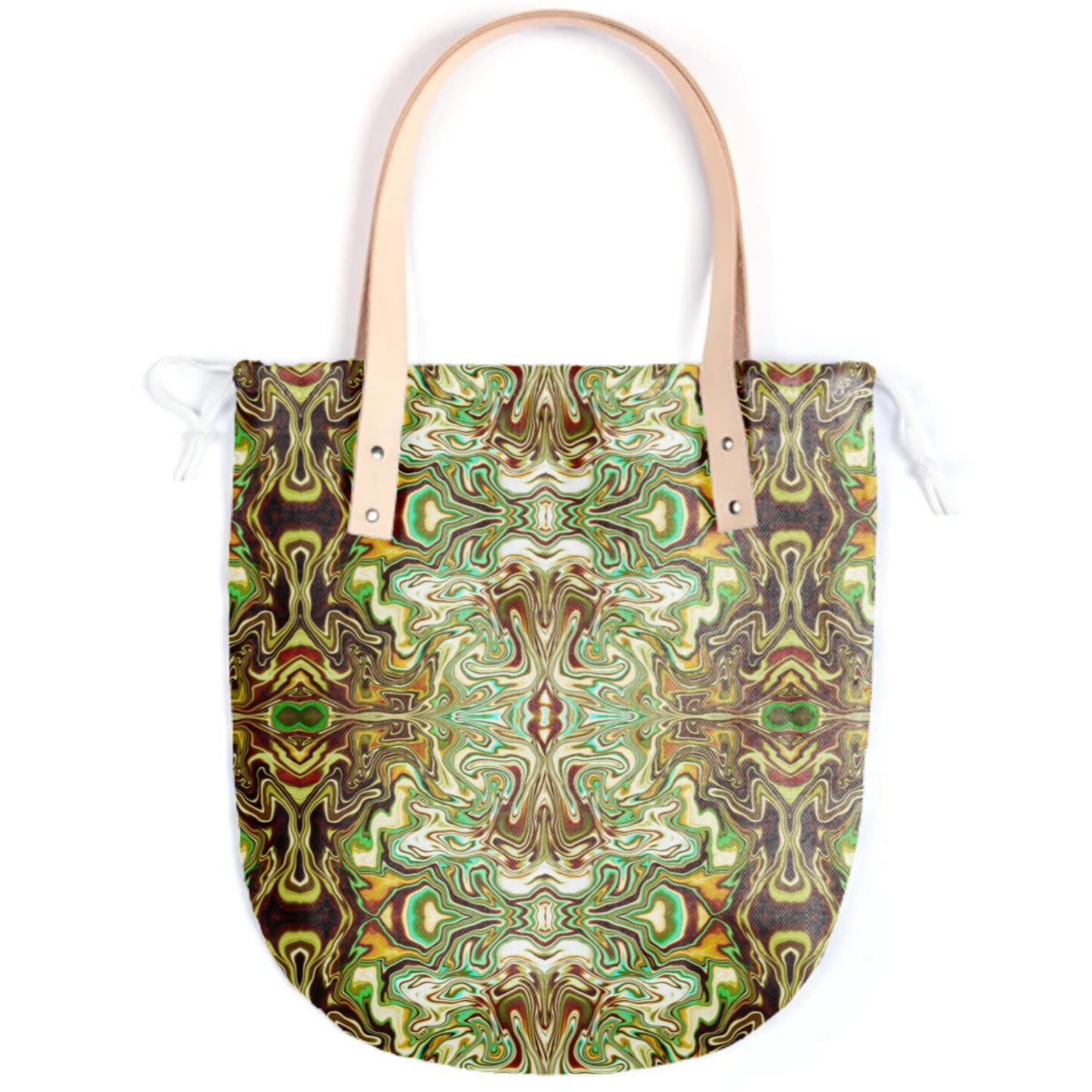 The Summer tote features a round bottom shape small inside patch pocket and tan or black leather handles.