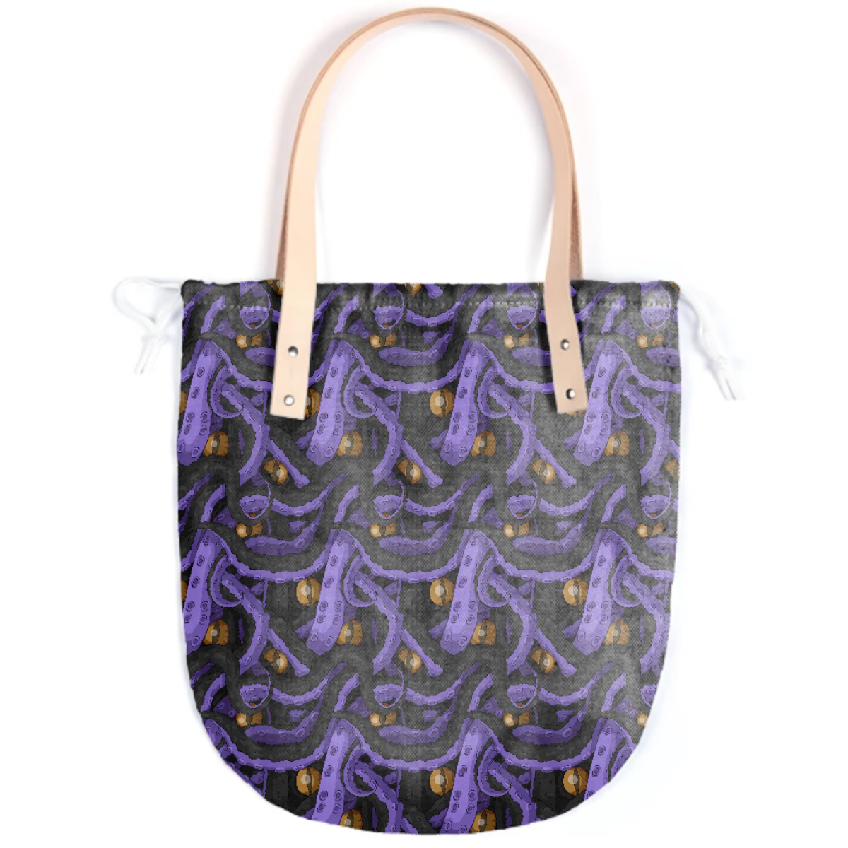The Summer tote features a round bottom shape small inside patch pocket and tan or black leather handles.