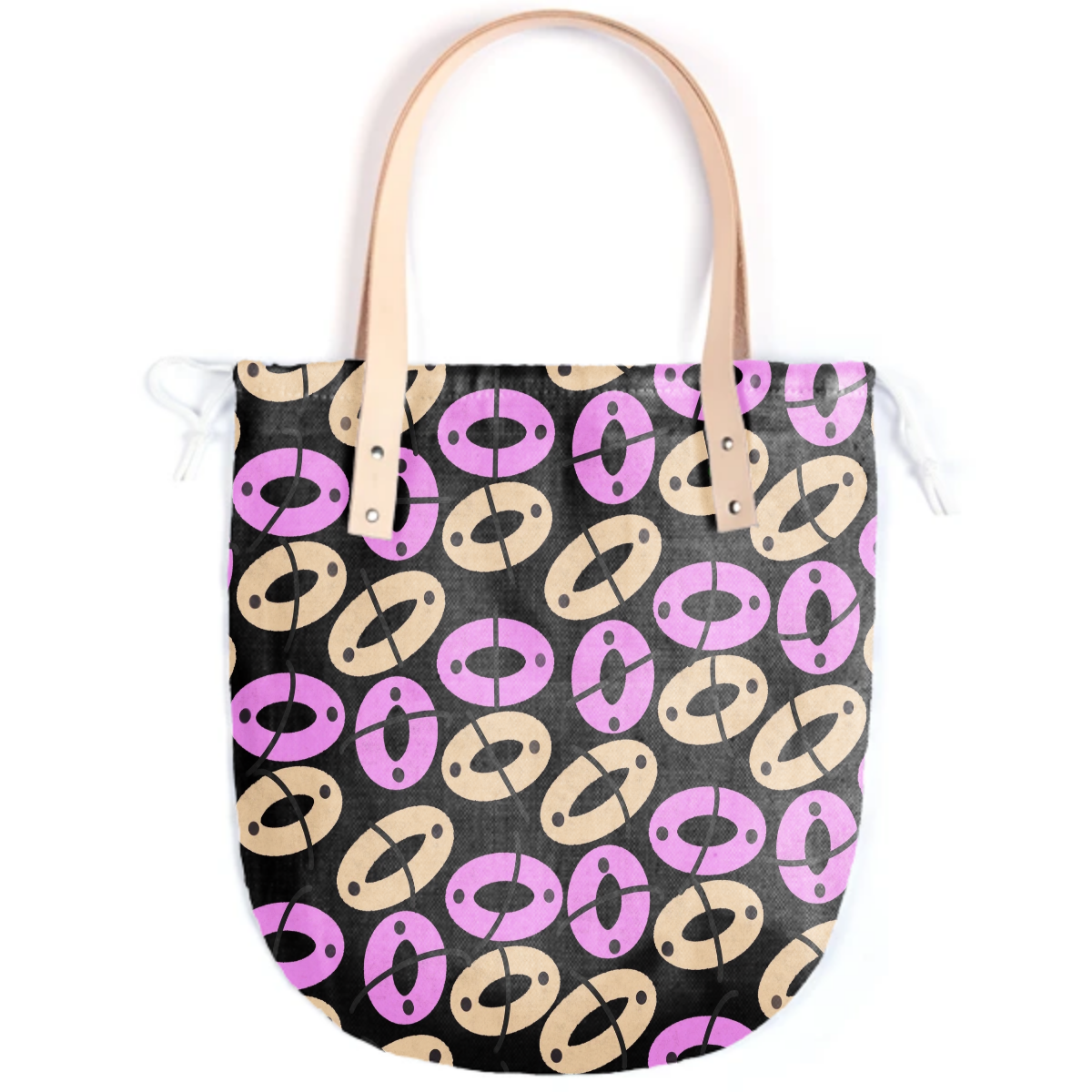The Summer tote features a round bottom shape small inside patch pocket and tan or black leather handles.