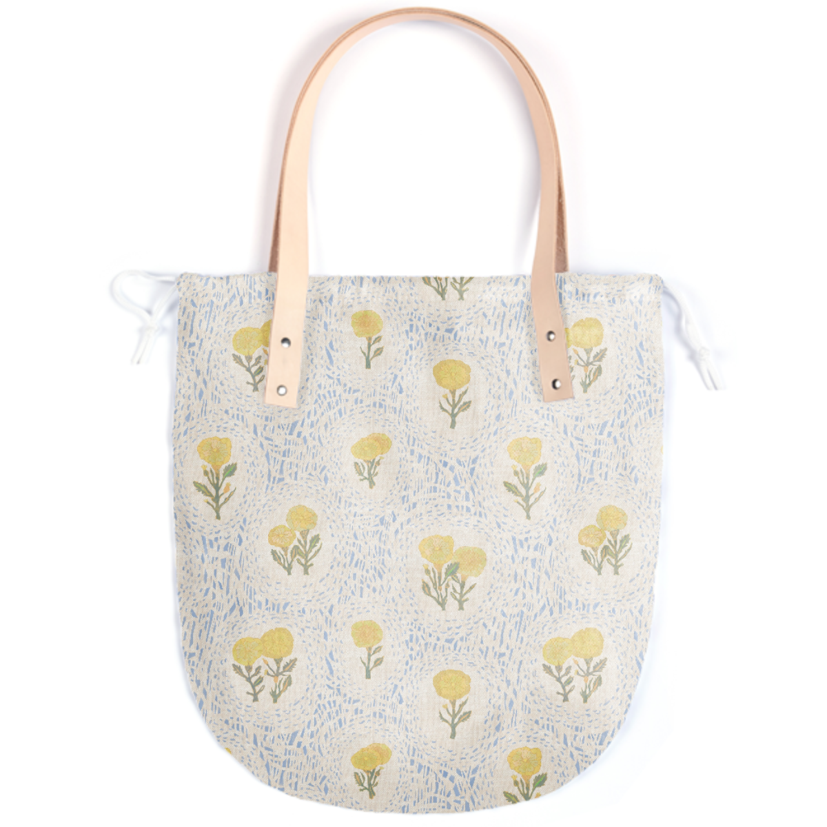 The Summer tote features a round bottom shape small inside patch pocket and tan or black leather handles.