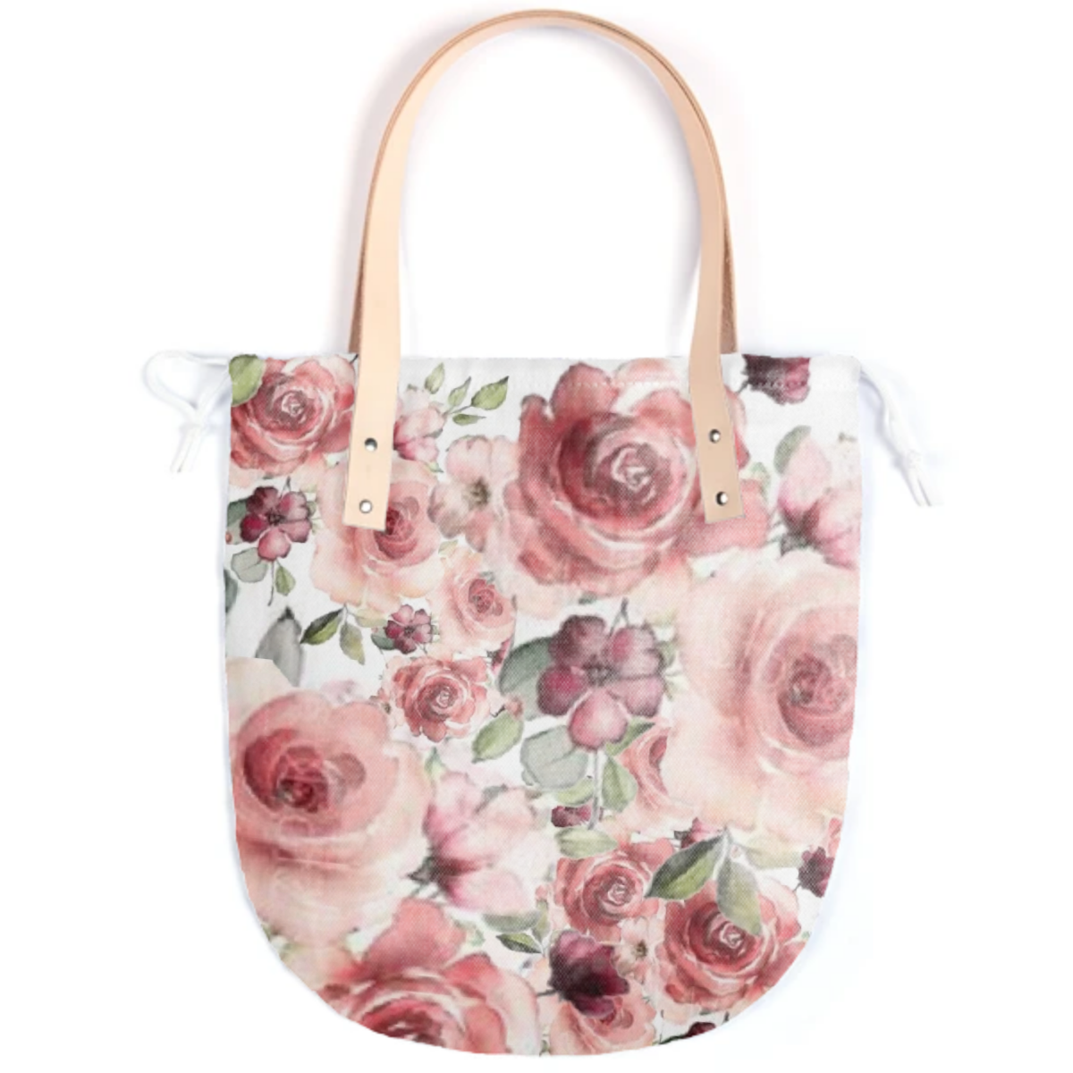 The Summer tote features a round bottom shape small inside patch pocket and tan or black leather handles.