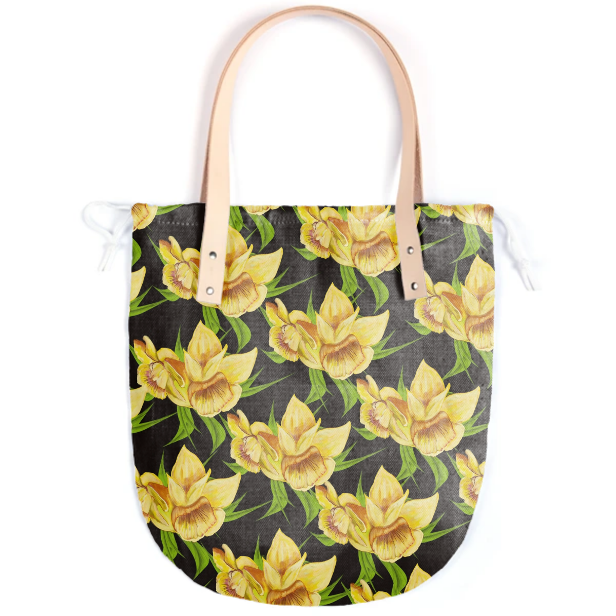 The Summer tote features a round bottom shape small inside patch pocket and tan or black leather handles.