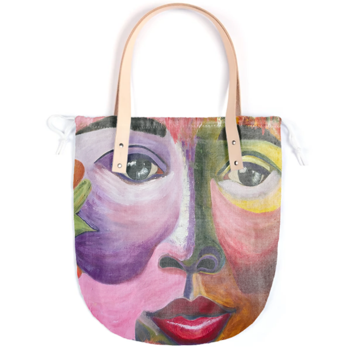 The Summer tote features a round bottom shape small inside patch pocket and tan or black leather handles.