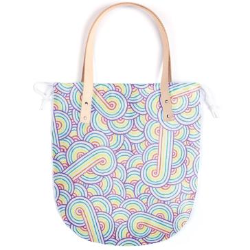 The Summer tote features a round bottom shape small inside patch pocket and tan or black leather handles.