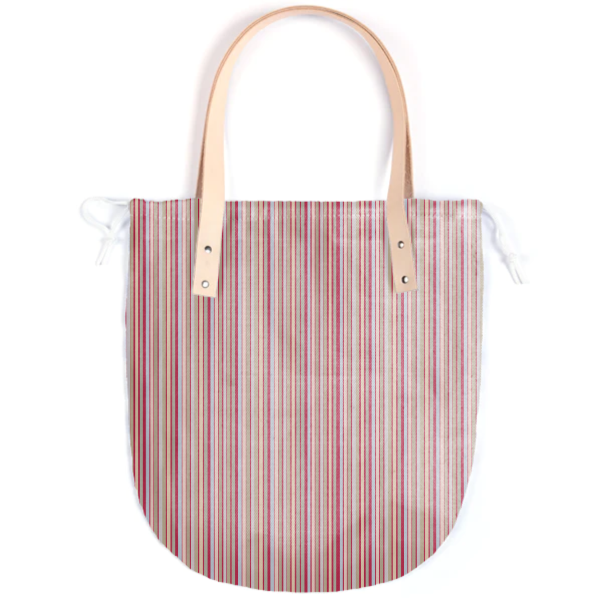 The Summer tote features a round bottom shape small inside patch pocket and tan or black leather handles.
