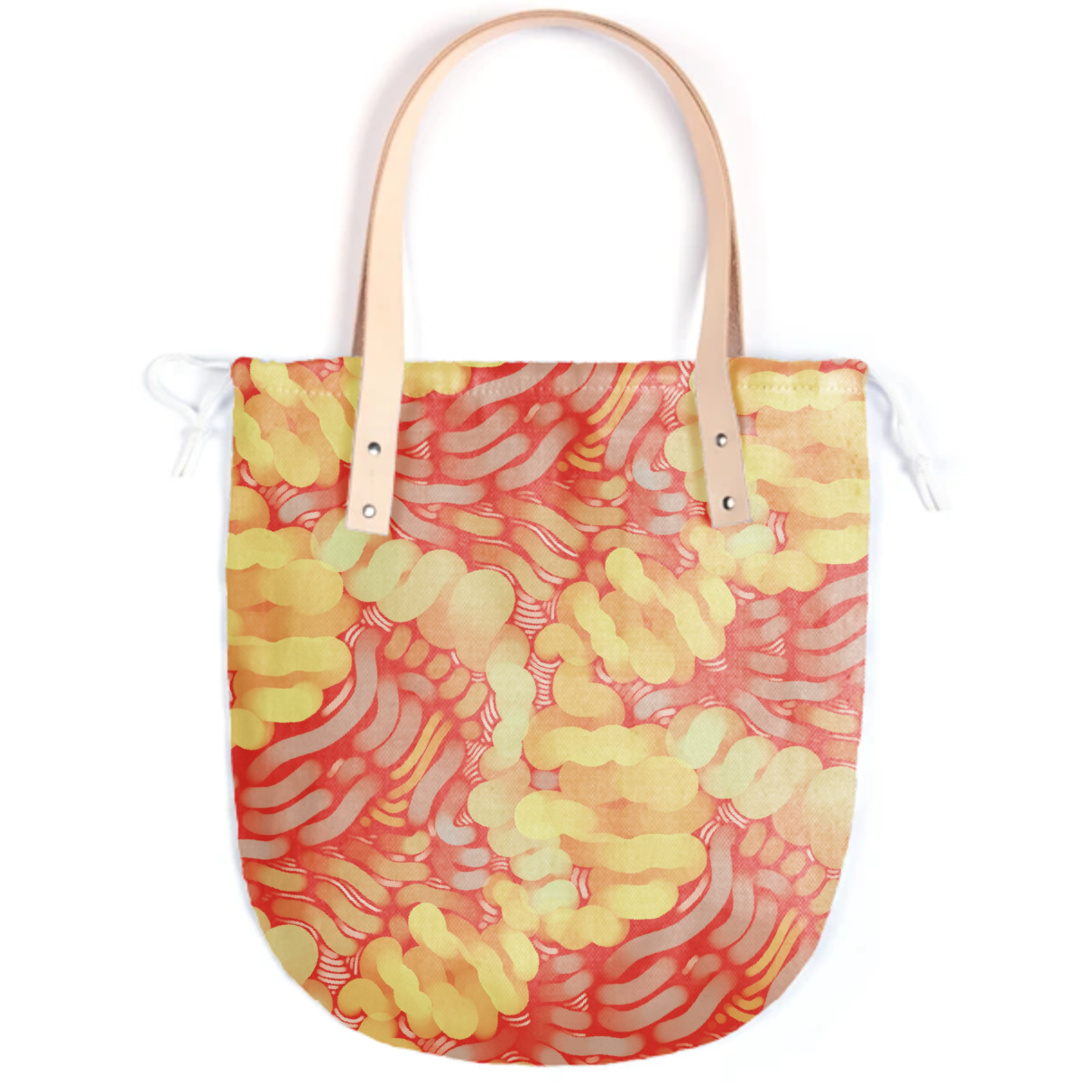 The Summer tote features a round bottom shape small inside patch pocket and tan or black leather handles.
