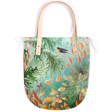 The Summer tote features a round bottom shape small inside patch pocket and tan or black leather handles.