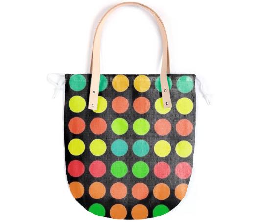 The Summer tote features a round bottom shape small inside patch pocket and tan or black leather handles.