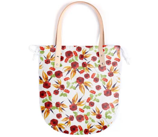 The Summer tote features a round bottom shape small inside patch pocket and tan or black leather handles.