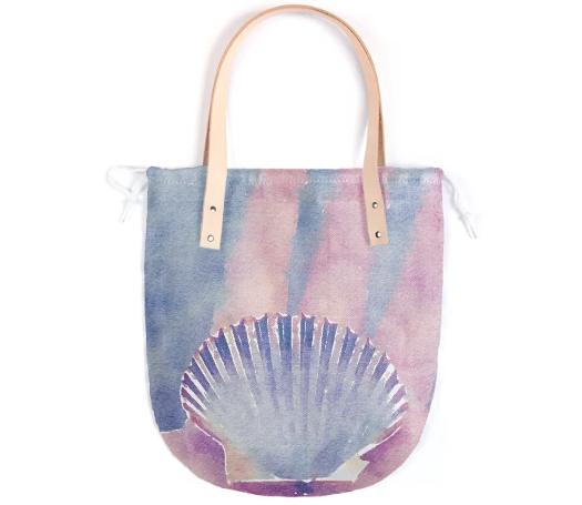 The Summer tote features a round bottom shape small inside patch pocket and tan or black leather handles.
