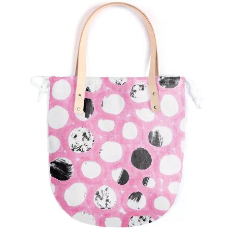 The Summer tote features a round bottom shape small inside patch pocket and tan or black leather handles.