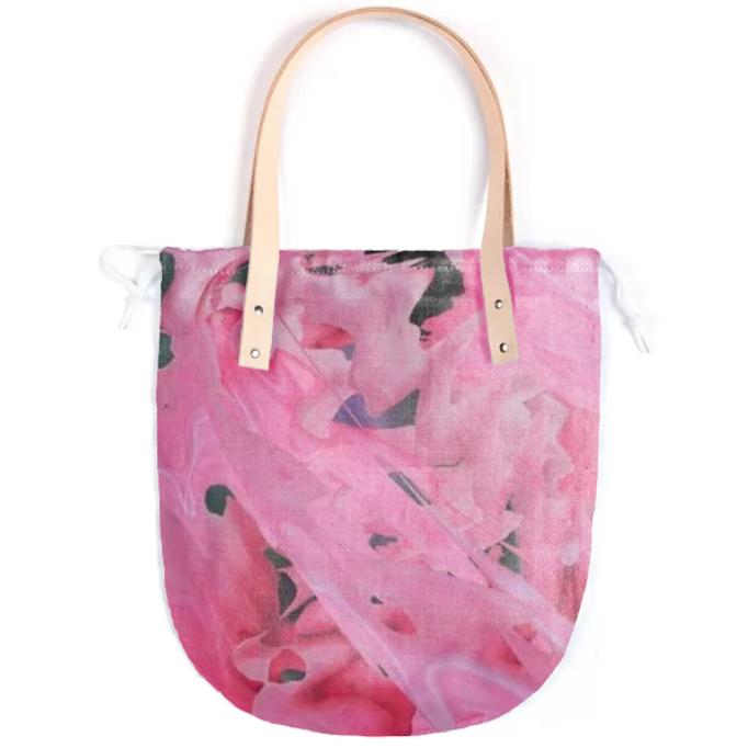 The Summer tote features a round bottom shape small inside patch pocket and tan or black leather handles.