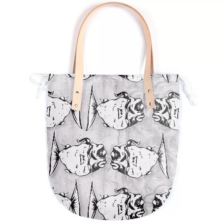The Summer tote features a round bottom shape small inside patch pocket and tan or black leather handles.