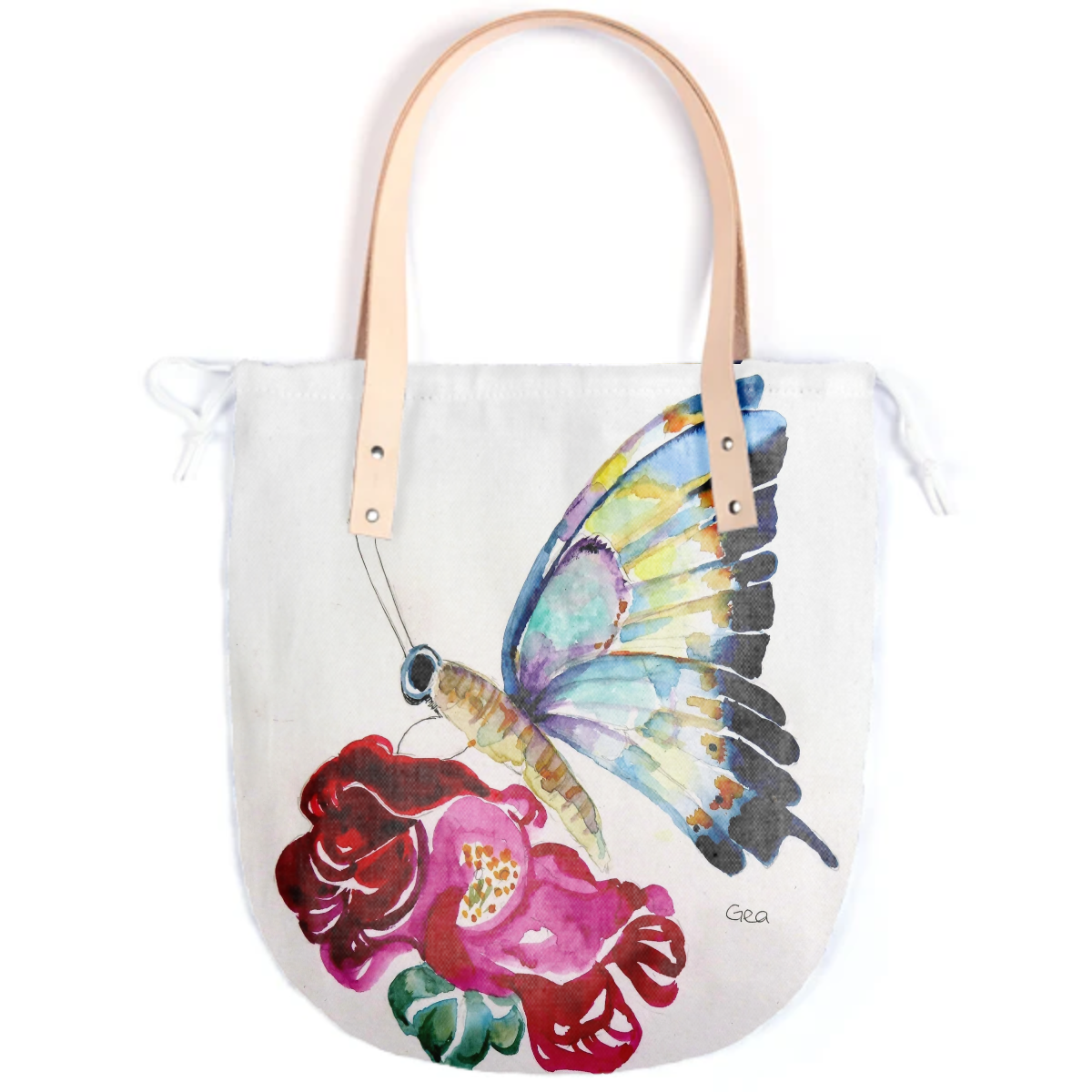 The Summer tote features a round bottom shape small inside patch pocket and tan or black leather handles.