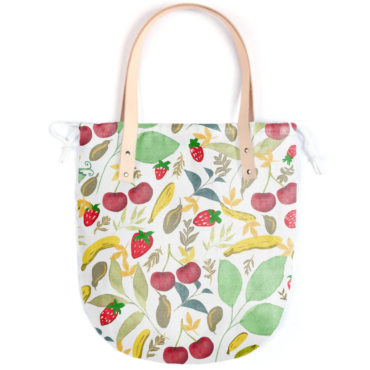 The Summer tote features a round bottom shape small inside patch pocket and tan or black leather handles.