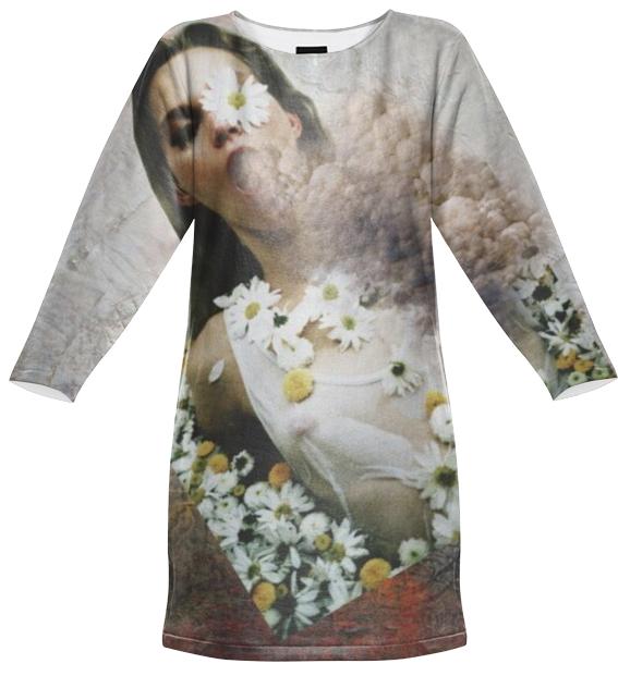 Long sleeve loose fitting sweatshirt dress with side seam pockets.