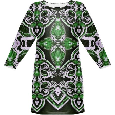 Long sleeve loose fitting sweatshirt dress with side seam pockets.