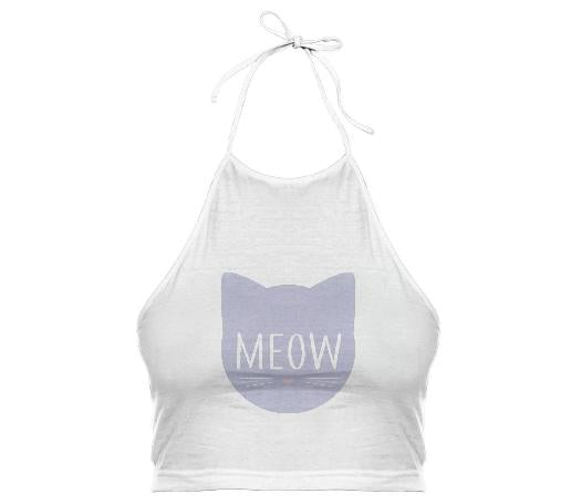 High neck halter top with adjustable ties. The back falls at the mid back and crops above the waist.