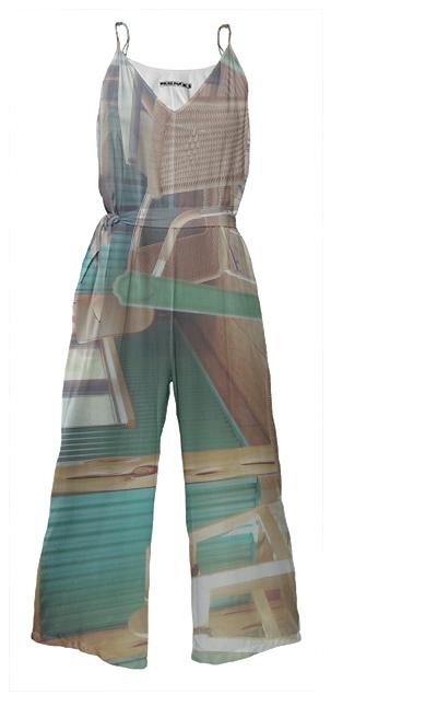 Wide leg jumpsuit with adjustable spaghetti straps invisible side seam zipper and a tie belt.