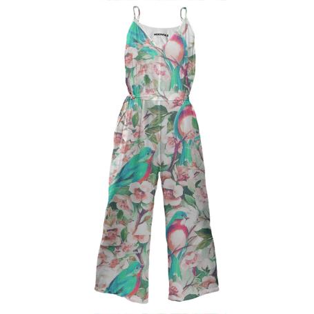 Wide leg jumpsuit with adjustable spaghetti straps invisible side seam zipper and a tie belt.