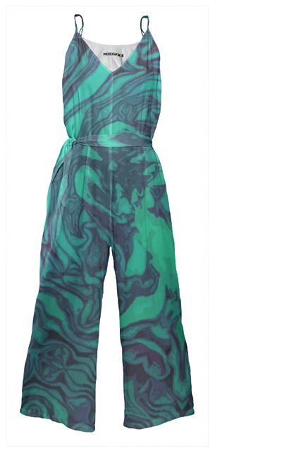 Wide leg jumpsuit with adjustable spaghetti straps invisible side seam zipper and a tie belt.
