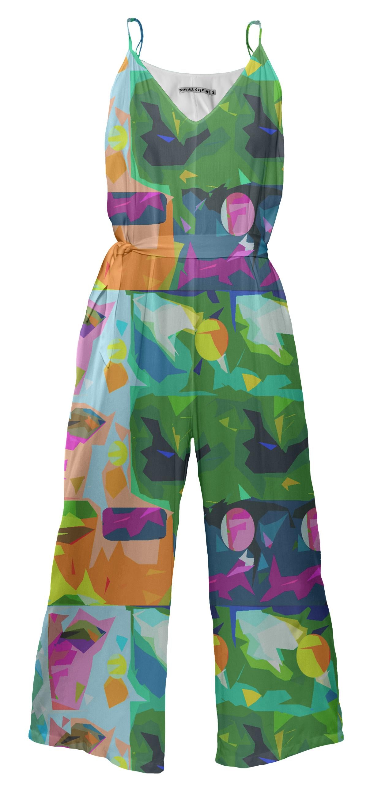 Wide leg jumpsuit with adjustable spaghetti straps invisible side seam zipper and a tie belt.