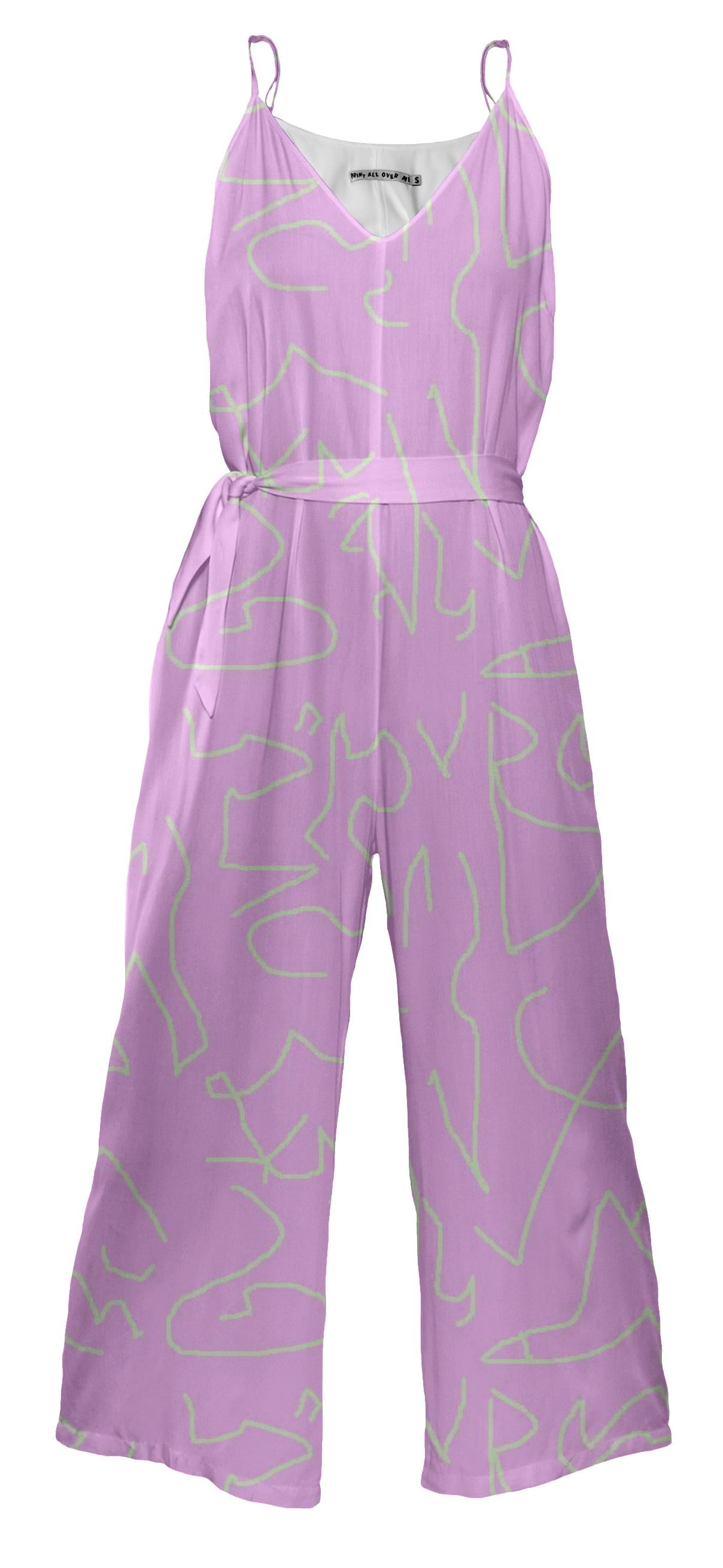 Wide leg jumpsuit with adjustable spaghetti straps invisible side seam zipper and a tie belt.