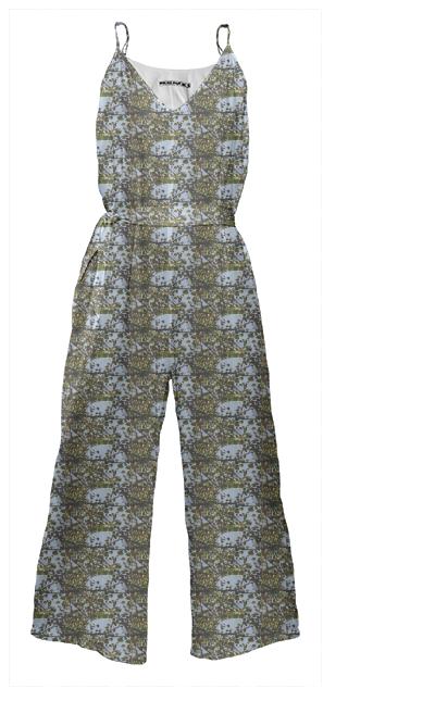 Wide leg jumpsuit with adjustable spaghetti straps invisible side seam zipper and a tie belt.