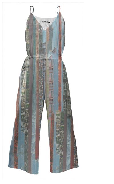 Wide leg jumpsuit with adjustable spaghetti straps invisible side seam zipper and a tie belt.