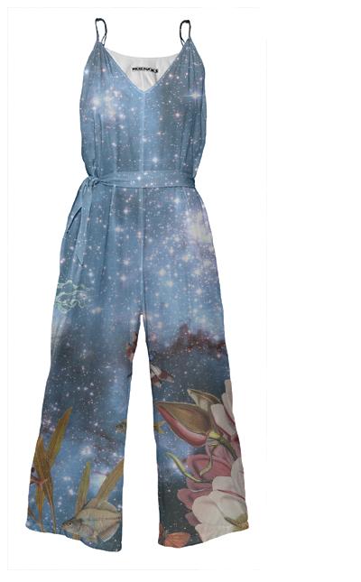 Wide leg jumpsuit with adjustable spaghetti straps invisible side seam zipper and a tie belt.