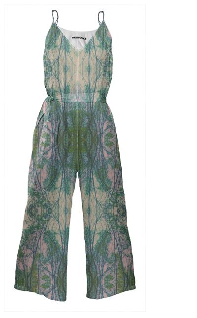 Wide leg jumpsuit with adjustable spaghetti straps invisible side seam zipper and a tie belt.