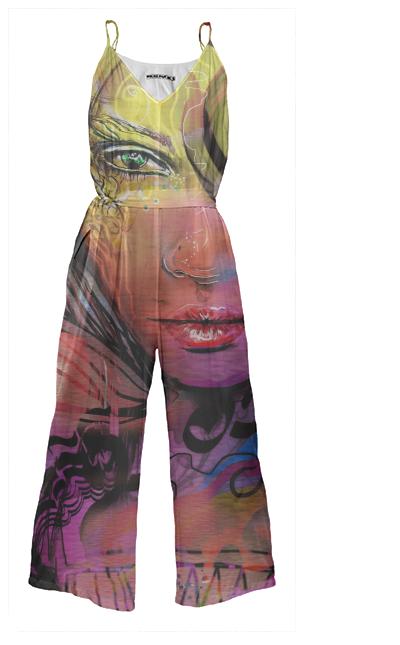 Wide leg jumpsuit with adjustable spaghetti straps invisible side seam zipper and a tie belt.