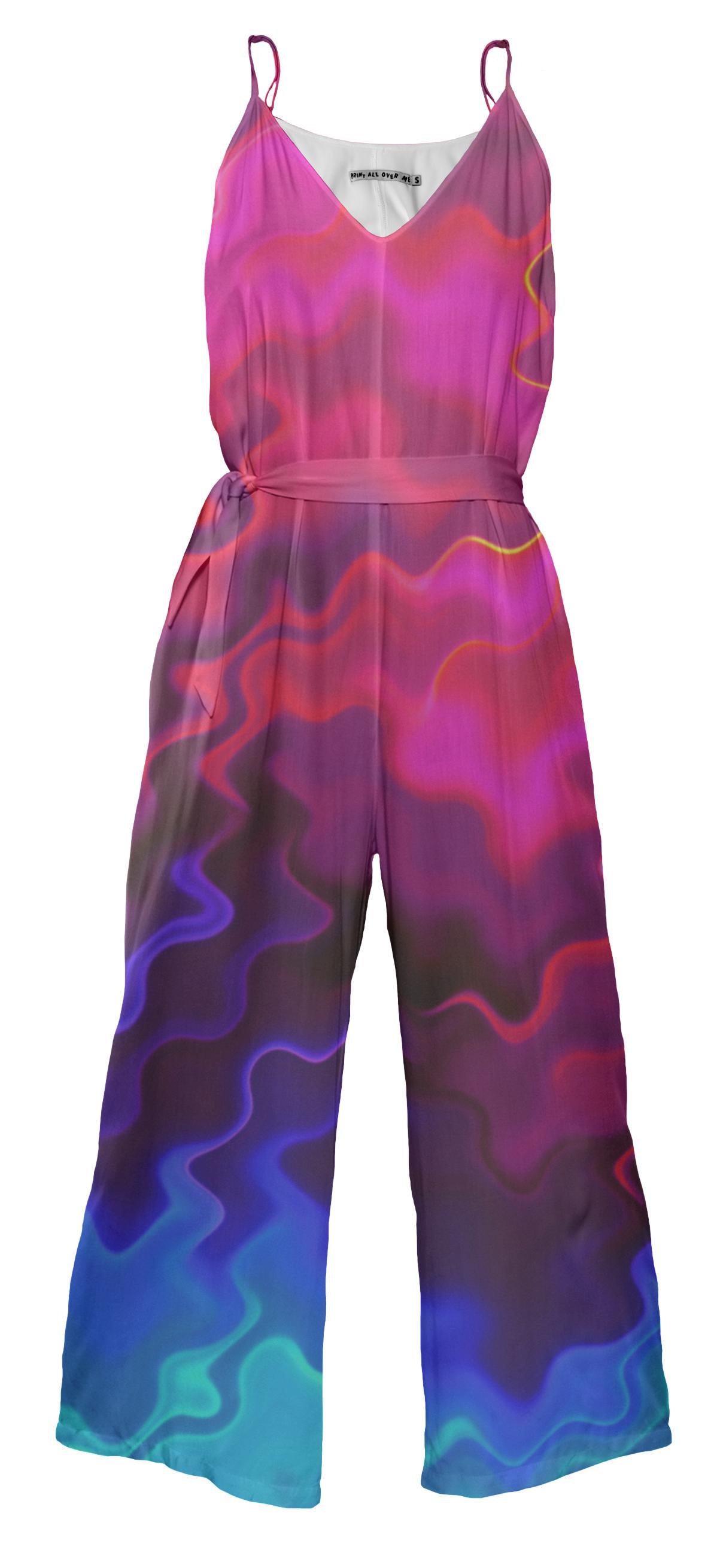 Wide leg jumpsuit with adjustable spaghetti straps invisible side seam zipper and a tie belt.
