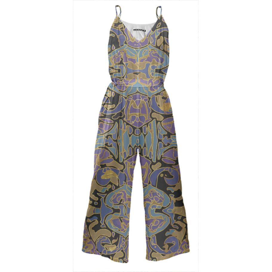 Wide leg jumpsuit with adjustable spaghetti straps invisible side seam zipper and a tie belt.