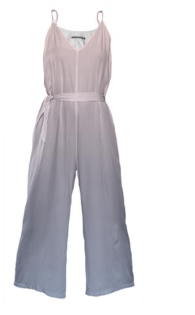 Wide leg jumpsuit with adjustable spaghetti straps invisible side seam zipper and a tie belt.