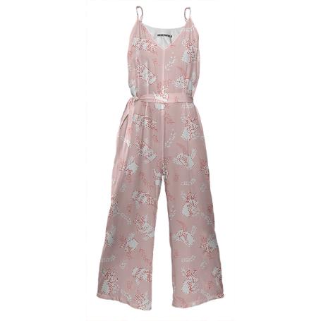 Wide leg jumpsuit with adjustable spaghetti straps invisible side seam zipper and a tie belt.