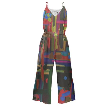 Wide leg jumpsuit with adjustable spaghetti straps invisible side seam zipper and a tie belt.