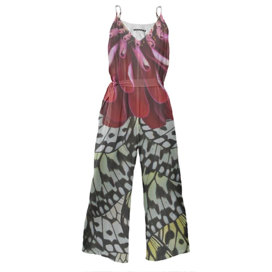 Wide leg jumpsuit with adjustable spaghetti straps invisible side seam zipper and a tie belt.